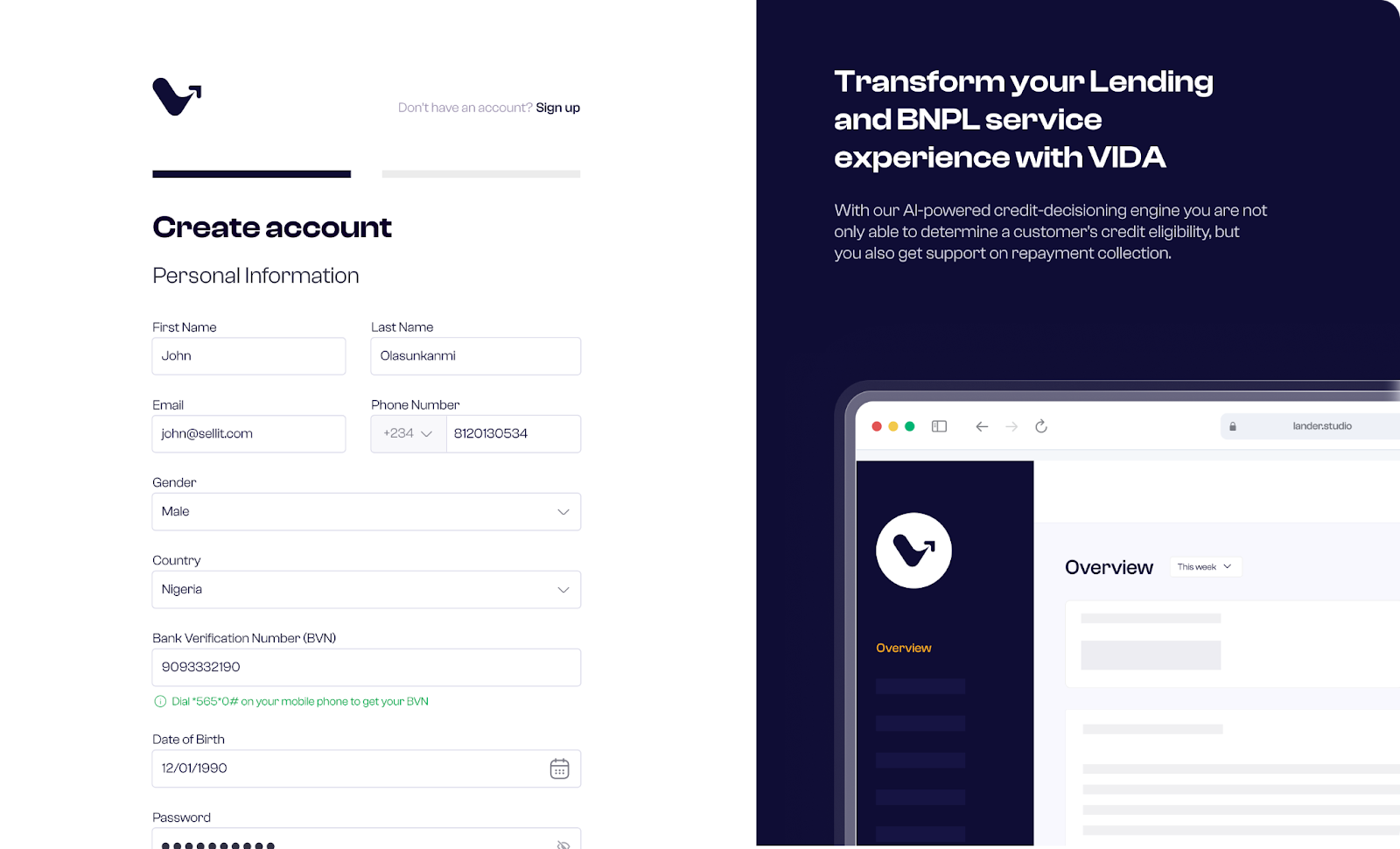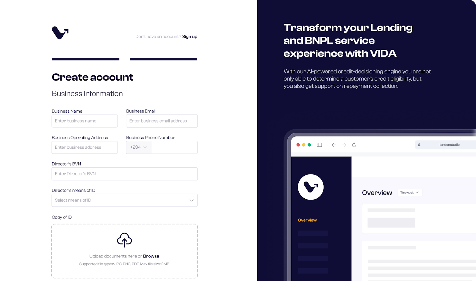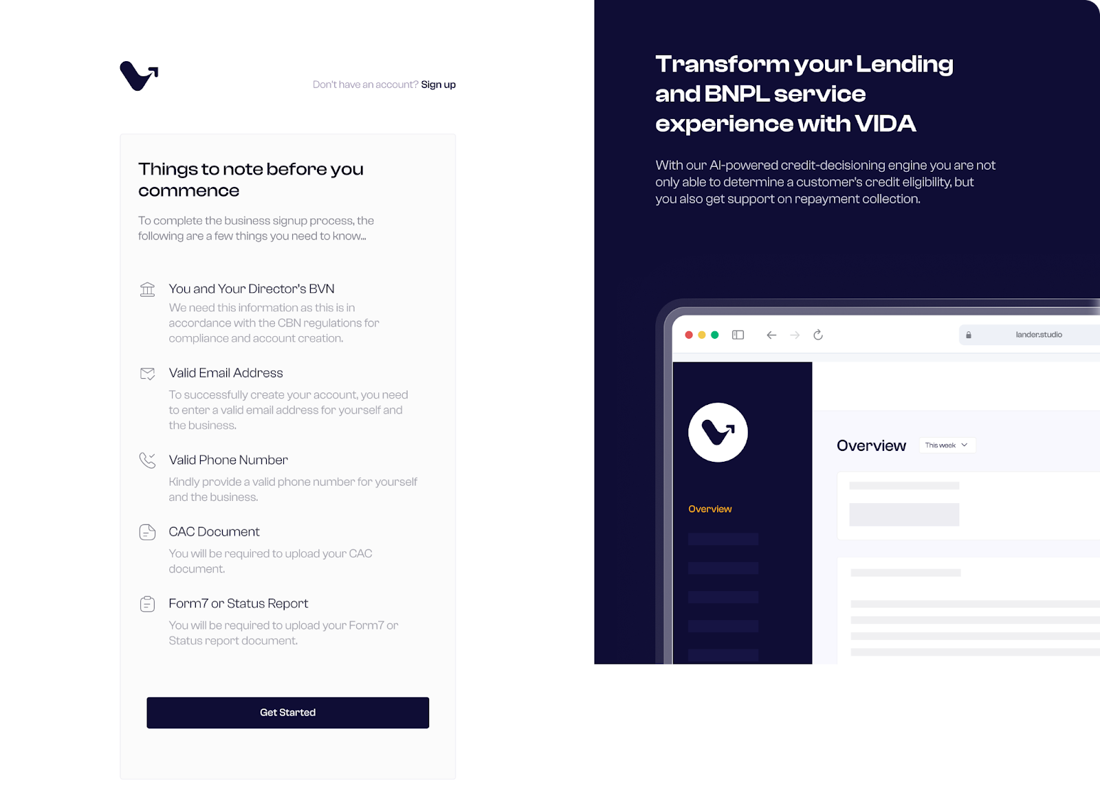 To sign up as a Lender offering Buy Now Pay Later Loans on Vida, there are certain requirements needed for a smooth process.