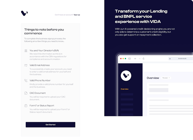 As a merchant, e.g., Konga, Gtech Stores, visit app.askvida.ai/signup, click on the "Get started" button