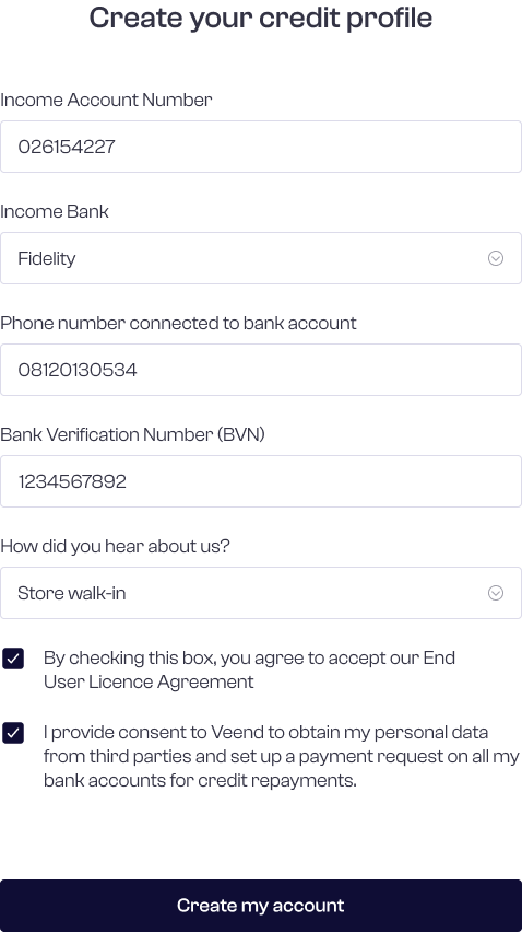 The customer is required to fill in their income account number, name of bank, phone number connected to bank account, BVN, and lastly, the customer is required to fill in how they heard about us.