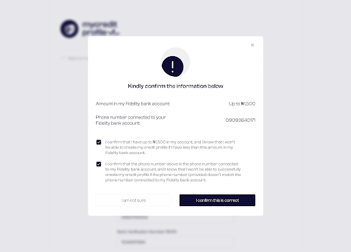 The customer sees a preview of the information he provided, i.e., the phone number connected to the account and confirms that he has up to 1,500 in his account. The 1,500 is the fee needed to get his bank statement from the bank. It may be more or less than 1,500, depending on the bank